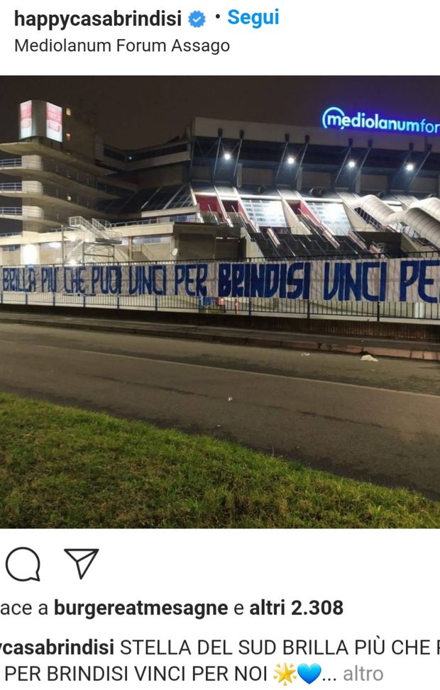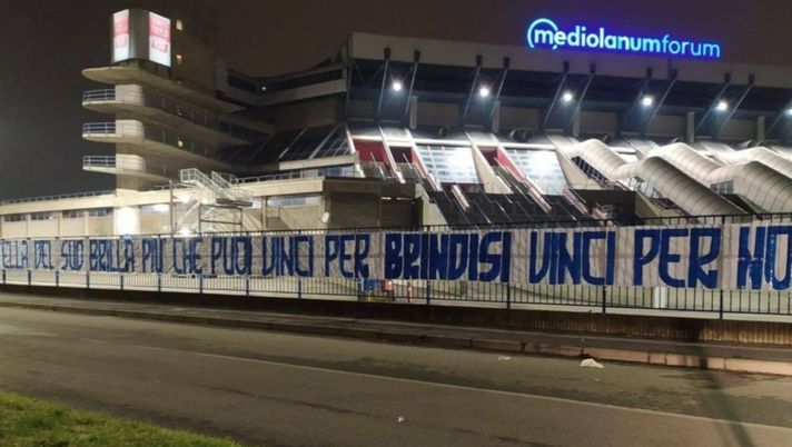 I tifosi di Brindisi avevano affisso uno striscione d'incitamento ai loro giocatori, sulle inferriate del Forum di Assago-Milanofiori