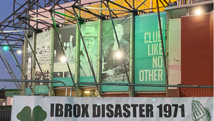 Ma ieri sera, i fan rivali, gli Hoops del Celtic, hanno mostrato di rispettare il dolore avversario intorno al loro stadio. Lo striscione dei tifosi biancoveri recita: "Ibrox Disaster 1971. Ricordiamo e preghiamo per le vittime e le loro famiglie". Mentre i fan dei Rangers hanno iniziato i loro tributi accanto alla statua di John Greig fuori Ibrox: "Tutti quelli della famiglia Rangers che non sono mai tornati a casa dai giochi all'Ibrox. Alzeremo un bicchiere nella vostra memoria, i nostri amici assenti". Un altro toccante tributo recitava: "In ricordo dei miei 66 compagni tifosi dei Rangers che hanno tragicamente perso la vita al nostro amato Ibrox. Mai dimenticare".