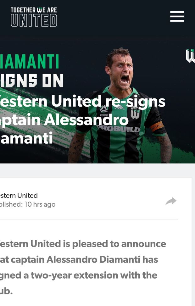L'ex nazionale italiano ha segnato cinque gol in 19 presenze e piazzato sette assist, nell'ultimo campionato A-League chiuso al secondo posto in campionato. "Abbiamo iniziato qualcosa di speciale quest'anno al Western United e sono entusiasta di rinnovare la firma e continuare il viaggio che abbiamo iniziato insieme", ha detto Diamanti. “Il nostro allenatore Mark Rudan mi ha supportato da quando sono arrivato e mi ha dato la libertà di godermi il calcio ed esprimermi, quindi lo ringrazio per questo. Sia lui che il club stanno costruendo qualcosa di speciale e voglio farne parte il più a lungo possibile" Diamanti ricondurrà la sua squadra in campo per il round di apertura della ripresa della stagione A-League giovedì 16 luglio, quando affronterà i rivali locali del Melbourne Victory nel derby.