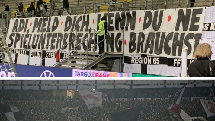 Rispetto alla gara che vedeva protagonisti Bayern e Hoffenheim, quest'ultimi sconfitti per 6-0 e costretti a più riprese al blocco della partita a causa degli insulti rivolti allo stesso dirigente, lo striscione esposto dai tifosi dell’Eintracht nella successiva partita di coppa “Adi facci sapere se ti serve una pausa in campo…” sembrava essere più un modo per sbeffeggiare una situazione che lo scorso weekend ha mostrato una brutta pagina del campionato di Bundesliga. Peccato che nello srotolare lo striscione, a chiusura di un attacco quasi ironico, il finale recitava “Dietmar Hopp figlio di una…madre".