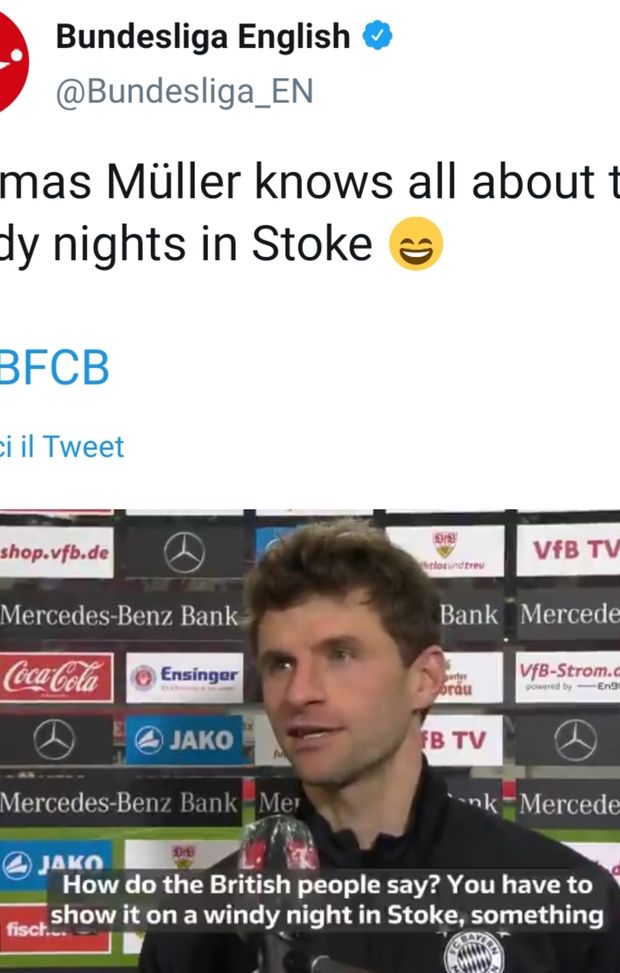 Il Bayern Monaco ha vinto contro lo Stoccarda, non senza faticare. Per spiegare la partita, Thomas Müller è ricorso alle leggendarie "notti di vento a Stoke", che hanno fatto storia in Premier e sui social, quando il campo dello Stoke City era teatro di autentiche battaglie nel maltempo. Una sorta di metafora delle vittorie calcisticamente "sporche".