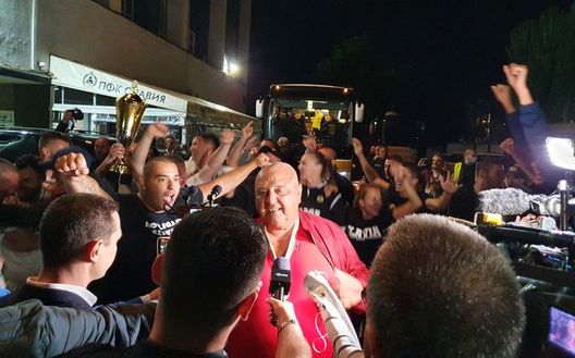 Altri tifosi dello Slavia Sofia hanno festeggiato la qualificazione con il presidente del club Ventseslav Stefanov. La loro squadra giocherà in Europa la prossima stagione e anche se le regole sul distanziamento vengono meno...