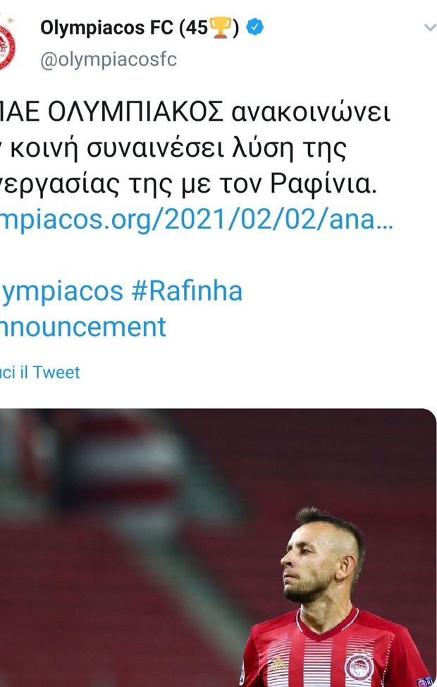 Cinque mesi dopo aver lasciato il Flamengo per l'Olympiacos, Rafinha dice addio anche alla Grecia. Il terzino destro ha incontrato i dirigenti della squadra greca e ha deciso di rescindere il contratto amichevolmente.