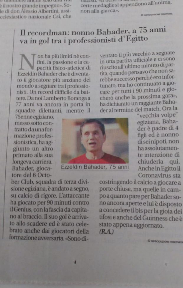 Un mese e mezzo dopo essere stato messo sotto contratto dal 6 October Club, squadra di terza divisione egiziana giocatore più anziano tesserato da una società professionistica), nella sua partita d'esordio, il 75enne Bahader ha battuto il record che apparteneva al portiere israeliano Isaak Hayik, in campo l'anno scorso in una gara di quarta divisione con la maglia dell'Ironi or Yehuda a 73 anni. Ma lui, Ezzeldin Bahader, ha segnato su rigore proprio al 90esimo.