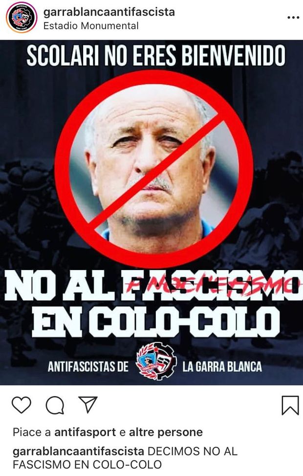 Da qui campeggiano alcune locandine con il volto di Scolari e il segnale di divieto, con la scritta: "Scolari non è il benvenuto. No al fascismo al Colo-Colo" si firmano gli "Antifascistas de la Garra Blanca", gruppo organizzato di uno dei club più popolari e titolati del Cile.