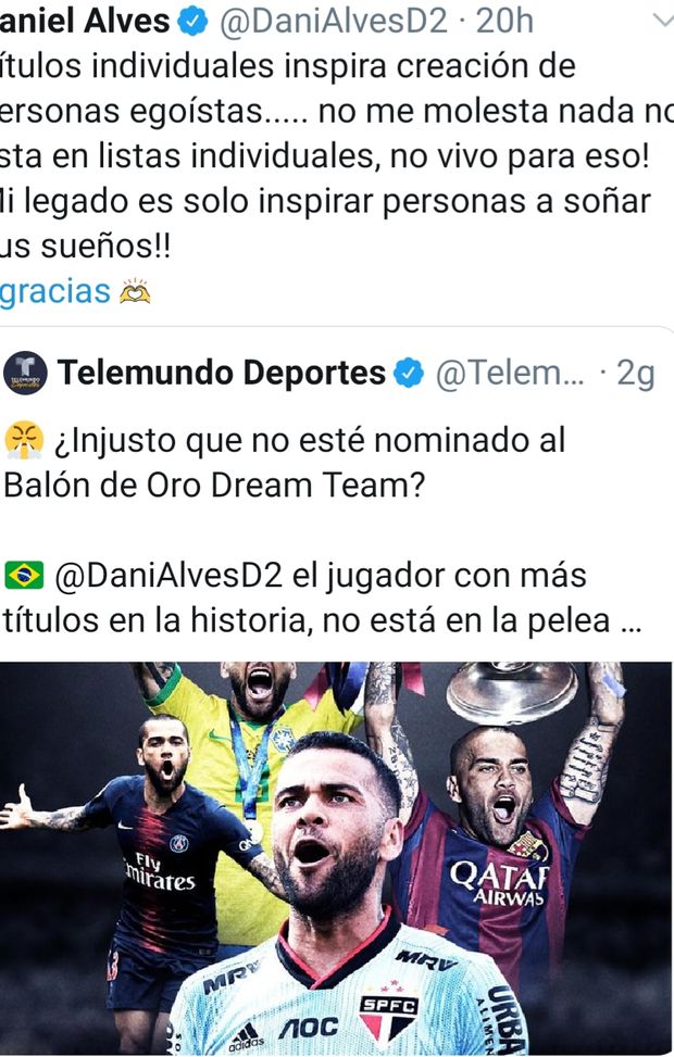 France Football ha selezionato i dieci migliori terzini destri della storia e ha escluso l'ex calciatore del Barcellona, attualmente al Sao Paolo, in Brasile. Ecco la risposta di Dani Alves dopo essere rimasto fuori dai finalisti del 'Golden Ball Dream Team': "Non mi disturba affatto non essere in queste liste individuali, non vivo per quello".