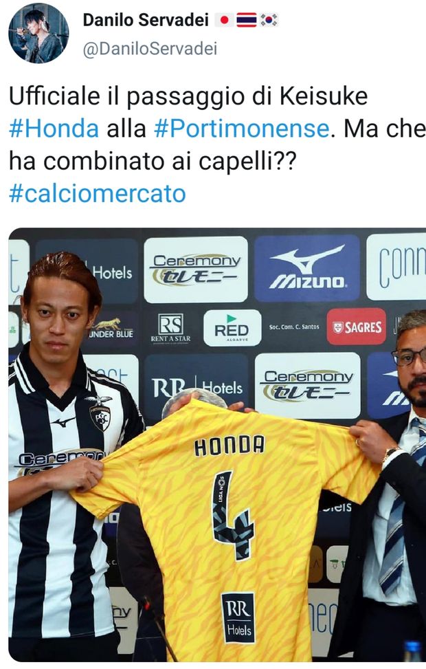 Keisuke Honda, con un colore di capelli rossiccio, tutto nuovo, giocherà nella Portimonense, squadra portoghese di prima divisione, fino alla fine della stagione, dopo essersi separato dal club brasiliano Botafogo, ha detto giovedì l'ex centrocampista giapponese. Il 34enne Honda, che ha avuto anche esperienze con Milan, CSKA Mosca, Vitesse Arnhem e VVV-Venlo, Pachuca e Melbourne Victory aveva rivelato la sua prossima destinazione sulla sua piattaforma di streaming audio NowVoice.
