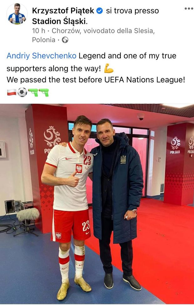 L'incontro è avvenuto al termine dell'amichevole Polonia-Ucraina 2-0, in cui la squadra di Sheva con Yarmolenko ha fallito un rigore e aveva avuto un'altra grande occasione per portare in vantaggio gli ucraini. A quel punto è passata in vantaggio la Polonia proprio con Kris Piatek. La prossima partita della nazionale ucraina si svolgerà il 14 novembre contro la Germania.
