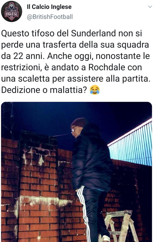 I gol di Charlie Wyke e Bailey Wright non sono stati sufficienti per il Sunderland di Phil Parkinson, costretto ad accontentarsi di una parte del bottino dopo un pareggio per 2-2 e dopo essere andata in vantaggio due volte. A seguire i Black Cats un tifoso, un semplice tifoso, che non si perde una trasferta da 22 anni. In League One, la Serie C inglese, gli stadi non sono delle cattedrali per cui lui ha potuto seguirsi il suo Rochdale-Sunderland 2-2 sulla sua scaletta...