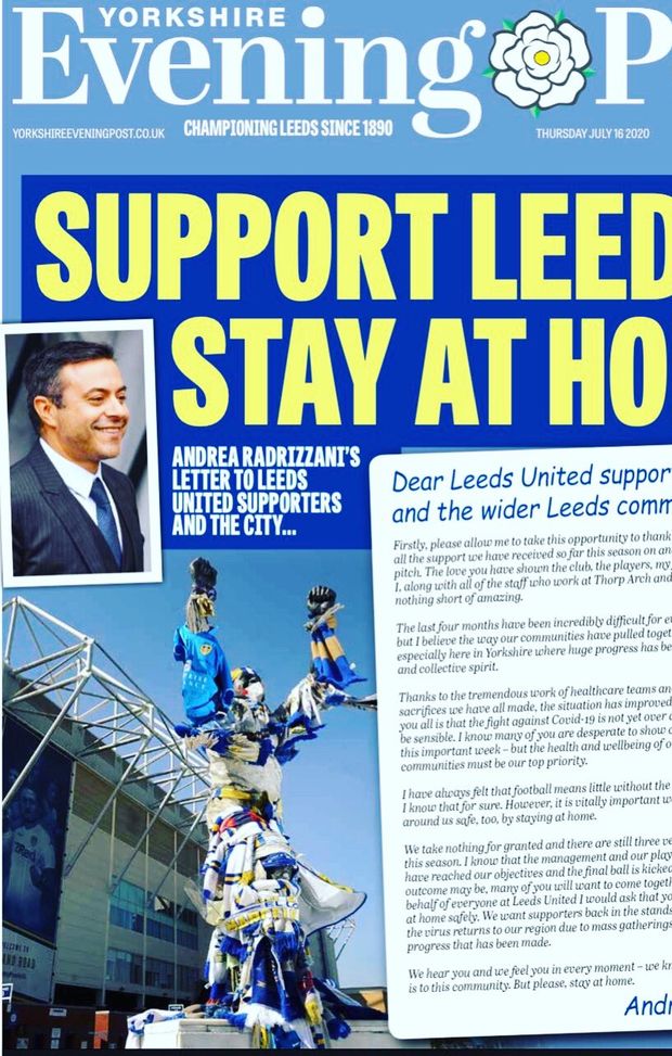 Una bella percussione di Bamford sulla destra ha propiziato la sfortunato autogoal che ha deciso il derby al 29'. La banda di Bielsa ora vede molto vicina la linea del traguardo: dopo la vittoria nel derby basterà un punto nel prossimo turno, contro il "Derby" County, stavolta. Da sottolineare la bellissima atmosfera a Elland Road, dopo le polemiche dello scorso mese per una clamorosa gaffe, con gli spalti dello stadio riempiti dai cartonati dei tifosi, come siamo abituati a vedere in vari stadi all'estero. Un modo per essere vicini ai tifosi e per mostrare la vicinanza al popolo del Leeds, a cui si è rivolto anche il patron del club, Andrea Radrizzani, con questa lettera pubblicata sul Yorkshire Evening Post.