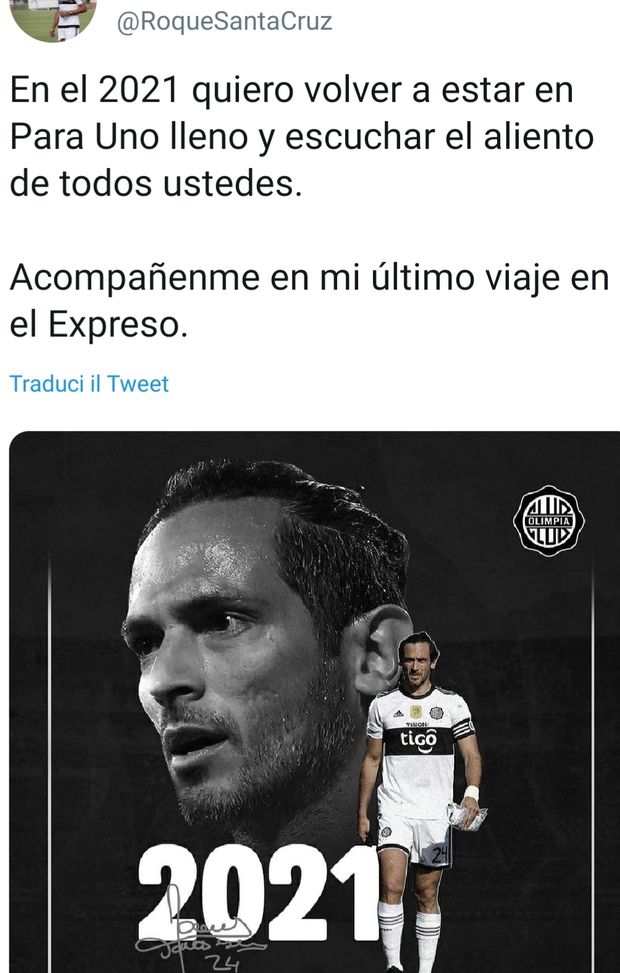 Il paraguaiano Roque Santa Cruz, 39 anni, ha annunciato che nel 2021 giocherà la sua ultima stagione da calciatore, il suo sarà un arrivederci dalle fila dell'Olimpia Asuncion, dove ha iniziato la sua carriera e in cui gioca dal 2016, dopo aver militato in diverse squadre fra Spagna, Germania e Messico. Santa Cruz, capocannoniere dell'attuale torneo di Clausura, con sette gol, è il giocatore più forte delle ultime stagioni nella prima divisione paraguaiana, oltre ad aver vinto sul piano collettivo quattro campionati consecutivi con l'Olimpia nei tornei Apertura e Clausura nel 2018 e 2019. "Prometto di continuare a lottare in maniera importante perché siamo l'Olimpia, ratifico il mio amore per questa maglia e nel 2021 nel mio ultimo anno da calciatore saremo di nuovo insieme", ha detto Santa Cruz al momento di annunciare la sua continuità con il club Re di Coppe del Paraguay.