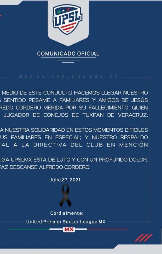 "Attraverso questo canale inviamo le nostre più sentite condoglianze alla famiglia e agli amici di Jesús Alfredo Cordero Merida per la sua morte. Era un giocatore del Conejos de Tuxpan de Veracruz. Tutta la nostra solidarietà in questi momenti difficili ai loro familiari in particolare; e il nostro pieno sostegno al consiglio di amministrazione del club in questione. La lega UPSLMX è in lutto e nel profondo dolore. Riposa in pace Alfredo Cordero".