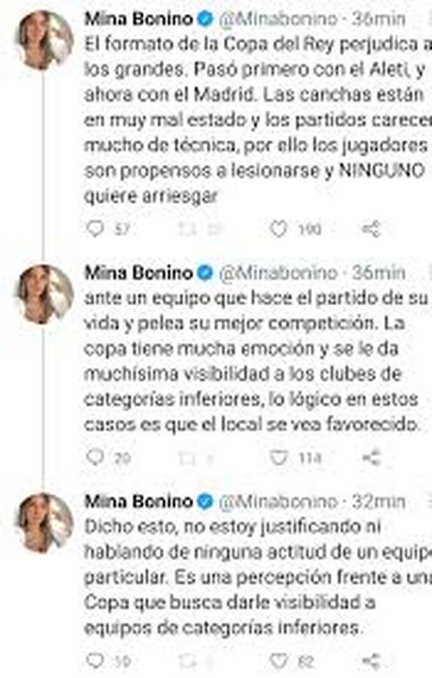 In pochi secondi Mina, che ha anche un figlio con Valverde, ha ricevuto centinaia di commenti sia dalla Spagna che dall'Argentina, chiedendo che la sua analisi non servisse da scusa per la prestazione mostrata dai Bianchi. Così in un terzo tweet ha chiarito la sua posizione: “Detto questo, non sto giustificando né parlando di alcun atteggiamento di una squadra in particolare. È una percezione di fronte a una Copa che cerca di dare visibilità a squadre di livello inferiore”.