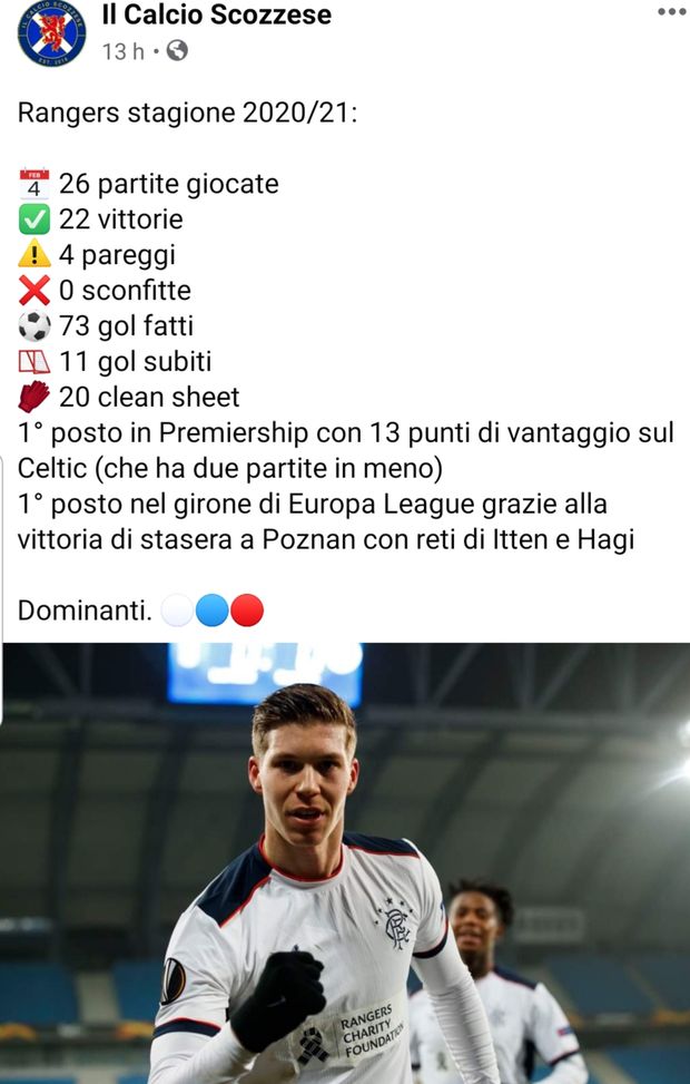 Che sia il Celtic in crisi a dare forza ed energia ai Rangers? O è forse stato il travolgente inizio di stagione della squadra di Steven Gerrard a indebolire e a frustrare i rivali biancoverdi? Il tema è aperto, visto che su 26 gare ufficiali giocate fino ad oggi, il bilancio dei Gers è semplicemente impressionante: 26 partite giocate, 22 vittorie, 4 pareggi, 0 sconfitte.