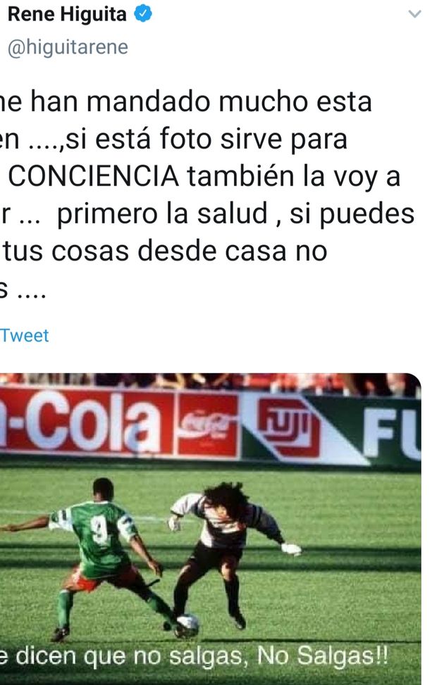 Anche Renè Higuita, uomo simbolo del calcio della Colombia, di cui ha difeso la porta per tanti anni, aderisce alla campagna di chi lancia appelli affinché, in epoca di Coronavirus, la gente non esca da casa. Così per diffondere lo slogan 'Non uscite', ha postato su Twitter la foto del suo celebre errore nella partita contro il Camerun degli ottavi dei Mondiali di Italia '90, che ai colombiani costò l'eliminazione.