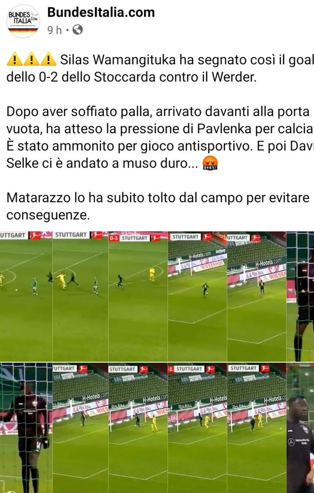 Durante la trasferta contro il Werder Brema, il 21enne congolese Wamangituka ha portato in vantaggio lo Stoccarda nel primo tempo dal dischetto. Poi, nel secondo tempo, nel recupero, al 91esimo, un pasticcio difensivo gli ha permesso di segnare la doppietta ma anche allo stesso tempo di farsi ammonire. Silas Wamangituka era solo davanti alla porta sguarnita, con il portiere Jiri Pavlenka e la difesa del Werder Brema ormai rassegnati al gol, ma lui ha deciso di sprecare qualche secondo perdendo tempo e aspettando la pressione degli avversari, prima di mandare la palla in fondo alla rete. È stato qualcosa che ha fatto guadagnare a Wamangituka un cartellino giallo per comportamento antisportivo con i tifosi sui social media che parlano del gol più irrispettoso di tutti i tempi.