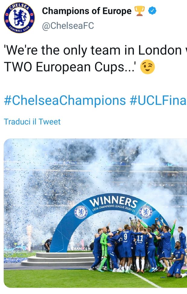Ma dopo la finale persa dall'Arsenal nel 2006 contro il Barcellona e quella più recente persa dal Tottenham contro il Liverpool, la soddisfazione londinese da derby i Blues se la tolgono: "Due Champions League, a Londra solo noi...".