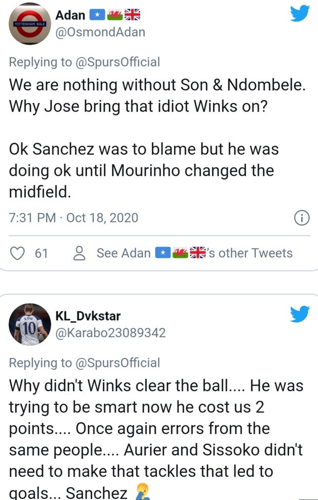 Le critiche riguardano anche Josè Mourinho, per aver tolto dal campo Son e Ndombelè ("Senza di loro non siamo nessuno", scrivono i tifosi) e per aver inserito in difesa Harry Winks...