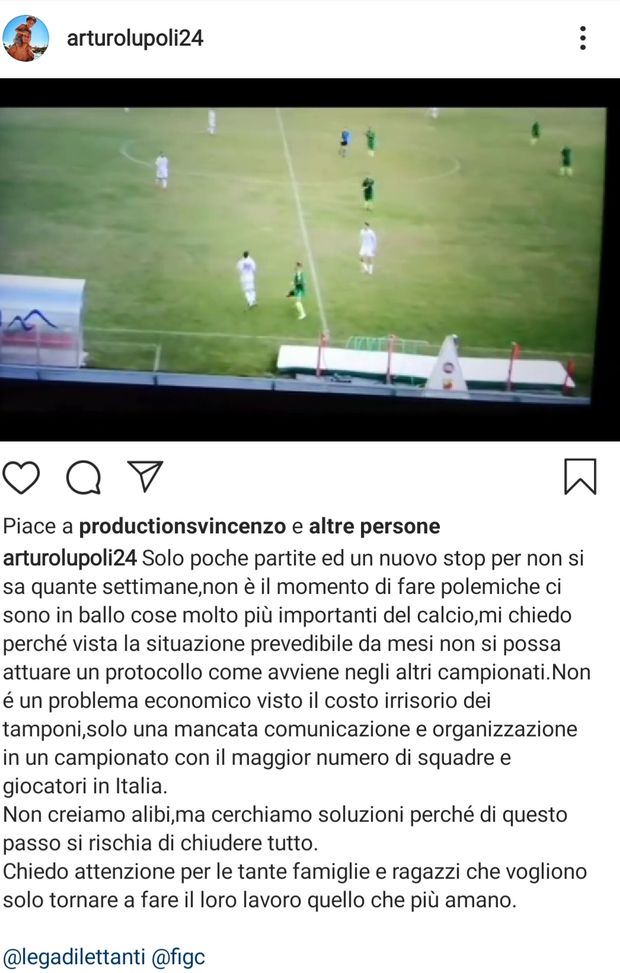 Ma in questo momento il campionato di Serie D è fermo per un mese, con le squadre che vanno in campo solo per i (tanti) recuperi. Secondo quanto stabilito dalla Lega Nazionale Dilettanti Cosimo Sibilia, non si giocherà nemmeno il 18 ed il 22 di questo mese. E' proprio questo il motivo dello sfogo di Arturo Lupoli su Instagram: "Mi chiedo perchè non si possa fare un protocollo per la Serie D come per gli altri campionati. Non è un problema economico, ma organizzativo. Chiedo attenzione per le tante famiglie e per i ragazzi che vogliono solo tornare a fare il loro lavoro, quello che più amano".