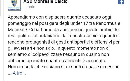 In un post dalla sua pagina fb il Monreale nega le accuse: "Apprendiamo con dispiacere quanto accaduto oggi pomeriggio nel post gara degli under 17 tra Panormus e Monreale. Ci battiamo da anni perché questo ambiente resti pulito e allontaniamo dalla nostra società quanti si rendono protagonisti di gesti antisportivi e offensivi per gli avversari e non solo. In questo momento non ci sentiamo di colpevolizzare nessuno in quanto non abbiamo appurato quanto realmente è accaduto. Non ci risulta che ci siano stati sputi da parte di nessun nostro ragazzo ma solamente la frase fuori luogo citata nel commento, subito redarguita dal nostro mister. Siamo certi che la realtà dei fatti sarà sotto gli occhi di tutti. Se la realtà è distante da quella che noi crediamo non esiteremo a prendere provvedimenti e porgere le scuse. Ci battiamo anche noi per un calcio giovanile pulito in cui la squadra che vince sia libera di festeggiare nel proprio spogliatoio nel rispetto degli avversari, senza che tutto ciò riscaldi gli animi degli addetti ai lavori"