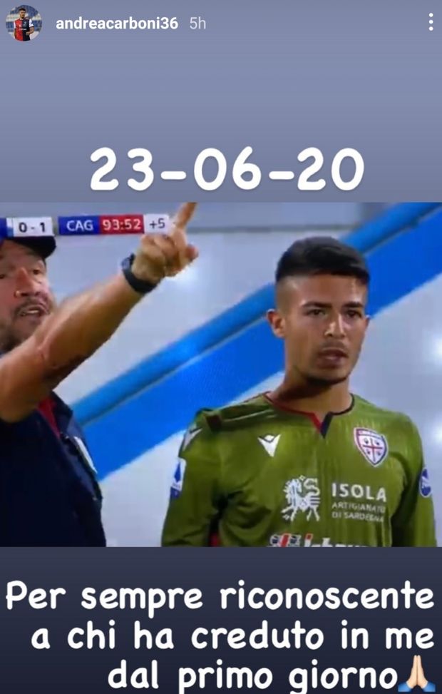 “Per sempre riconoscente a chi ha creduto in me fin dal primo giorno” ha scritto sui social Carboni postando una foto del suo primo ingresso in campo accanto al mister che lo ha lanciato. Un chiaro ringraziamento a Zenga per la chance concessa, senza dimenticare Max Canzi, mentore della Primavera rossoblù che lo ha aiutato a fare il salto in prima squadra, come ricorda Calciocasteddu.it.