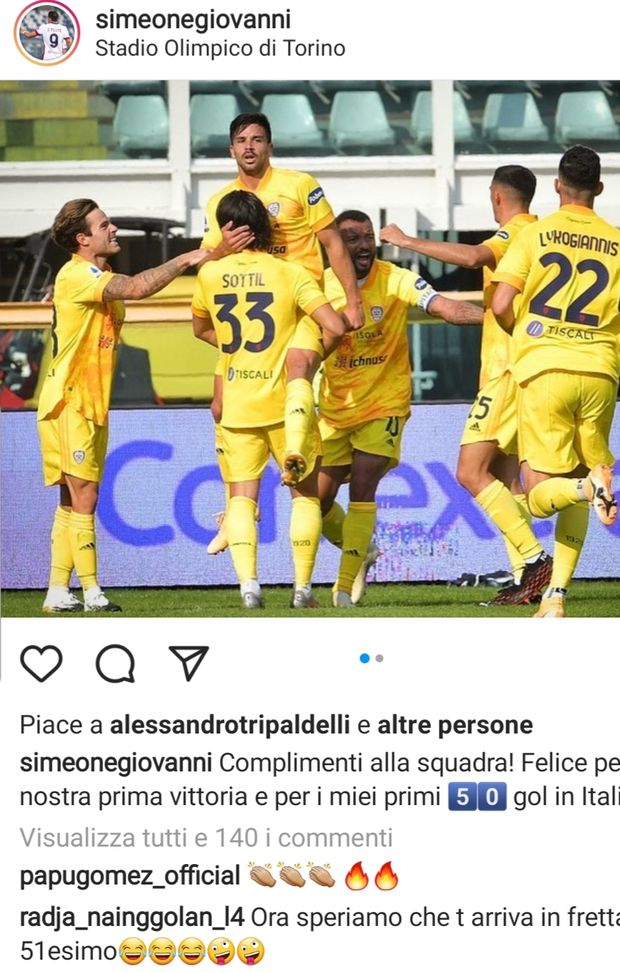 Il Cagliari conquista la prima vittoria in casa del Torino grazie alle reti di Joao Pedro e Simeone (doppietta) e la celebrazione di una domenica speciale, in cui i giocatori sardi hanno postato sui loro social le foto del match, diventa quasi un gemellaggio con lo spogliatoio dell'Inter. Ad aprire le danze è stato Alessio Cragno: "Una vittoria cercata, voluta e ottenuta, bravi ragazzi!!!"