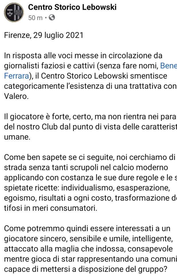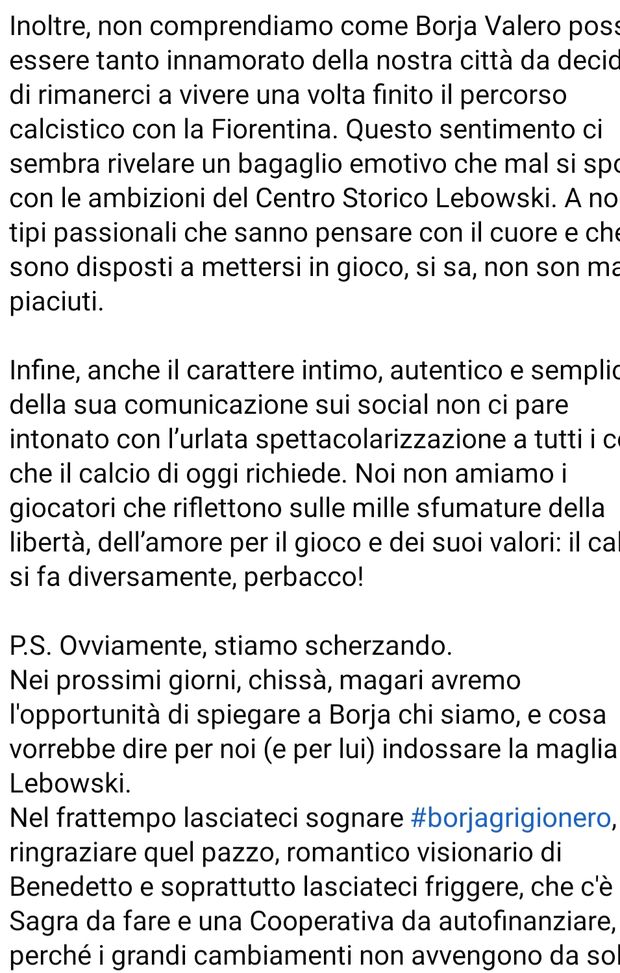 Il comunicato: "In risposta alle voci messe in circolazione da giornalisti faziosi e cattivi (senza fare nomi, Benedetto Ferrara), il Centro Storico Lebowski smentisce categoricamente l’esistenza di una trattativa con Borja Valero. Il giocatore è forte, certo, ma non rientra nei parametri del nostro Club dal punto di vista delle caratteristiche umane. Come ben sapete se ci seguite, noi cerchiamo di farci strada senza tanti scrupoli nel calcio moderno applicando con costanza le sue dure regole e le sue spietate ricette: individualismo, esasperazione, egoismo, risultati a ogni costo, trasformazione dei tifosi in meri consumatori. Come potremmo quindi essere interessati a un giocatore sincero, sensibile e umile, intelligente, attaccato alla maglia che indossa, consapevole mentre gioca di star rappresentando una comunità, capace di mettersi a disposizione del gruppo? Inoltre, non comprendiamo come Borja Valero possa essere tanto innamorato della nostra città da decidere di rimanerci a vivere una volta finito il percorso calcistico con la Fiorentina. Questo sentimento ci sembra rivelare un bagaglio emotivo che mal si sposa con le ambizioni del Centro Storico Lebowski. A noi i tipi passionali che sanno pensare con il cuore e che sono disposti a mettersi in gioco, si sa, non son mai piaciuti. Infine, anche il carattere intimo, autentico e semplice della sua comunicazione sui social non ci pare intonato con l’urlata spettacolarizzazione a tutti i costi che il calcio di oggi richiede. Noi non amiamo i giocatori che riflettono sulle mille sfumature della libertà, dell’amore per il gioco e dei suoi valori: il calcio si fa diversamente, perbacco! P.S. Ovviamente, stiamo scherzando.