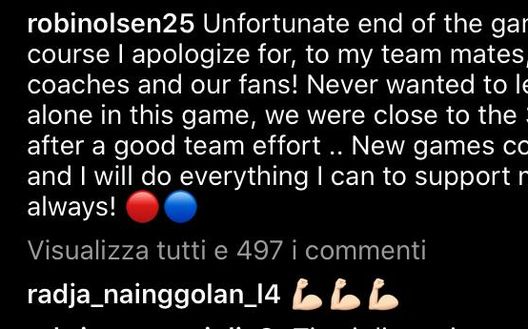 "Finale di gara sfortunato per cui ovviamente mi scuso, con i miei compagni, i miei allenatori e i nostri tifosi. Non ho mai voluto lasciarli soli in questa partita. Siamo stati vicini ai 3 punti dopo un buon sforzo di squadra. Ci sono nuove gare in arrivo e farò tutto il possibile per supportare la mia squadra come sempre». Si è scusato così Robin Olsen sul proprio account Instagram dopo lo scatto di nervi di Lecce.