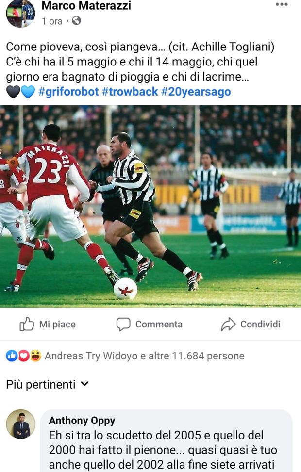 Marco Materazzi ha postato su Instagram una foto emblematica: il 14 maggio 2000 era difensore del Perugia che avrebbe battuto la Juventus al “Curi” nella gara rimasta nella storia per la lunga sospensione e il gol di Calori che consegnò lo scudetto alla Lazio. “C’è chi ha il 5 maggio e chi il 14 maggio”, ha scritto l’ex difensore.
