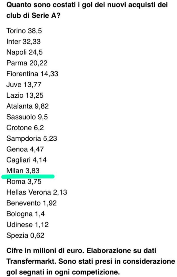 Alla domanda hanno risposto TMW e Ivan Cardia: ogni marcatura di un volto nuovo del Torino è costata 38,5 milioni di euro. L’Inter, al netto delle entrate, ha speso 97 milioni di euro. Se si considerassero solo i gol segnati in campionato dai nuovi acquisti, ognuno sarebbe “costato” 48,5 milioni. Dato a cui va aggiunto anche quello siglato da Perisic in Champions, la quota si abbassa a 32,33 milioni ogni gol. Stesso discorso per la Juventus. I gol meno costosi del campionato sono stati quelli dello Spezia: ogni rete di un nuovo acquisto è costata “solo” 620 mila euro.