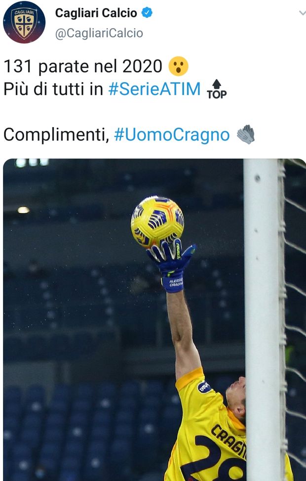 Alessio Cragno, portiere del Cagliari, talento in fiore nato nel 1994, ha effettuato ben 131 parate nell'anno solare 2020. La società sarda ha voluto celebrare la statistica e il suo rendimento sul proprio profilo ufficiale social...