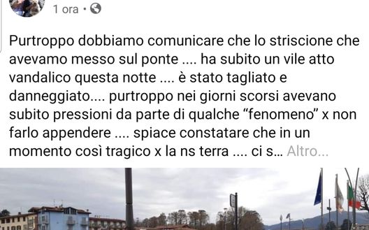 Questa l'amara constatazione del club Amici dell'Atalanta Gianpaolo Bellini di Sarnico: "Purtroppo dobbiamo comunicare che lo striscione che avevamo messo sul ponte ha subito un vile atto vandalico questa notte, è stato tagliato e danneggiato. Purtroppo nei giorni scorsi avevano subito pressioni da parte di qualche “fenomeno” per non farlo appendere, spiace constatare che in un momento così tragico per la nostra terra, ci sia qualcuno che si permette di compiere certe cose, che tristezza".