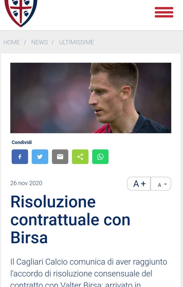 Queste le parole del comunicato del Cagliari: "Il Cagliari Calcio comunica di aver raggiunto l’accordo di risoluzione consensuale del contratto con Valter Birsa: arrivato in Sardegna nel gennaio del 2019, il centrocampista sloveno ha collezionato 28 presenze in maglia rossoblù. Il Club augura a Valter le migliori fortune per il continuo della sua carriera".