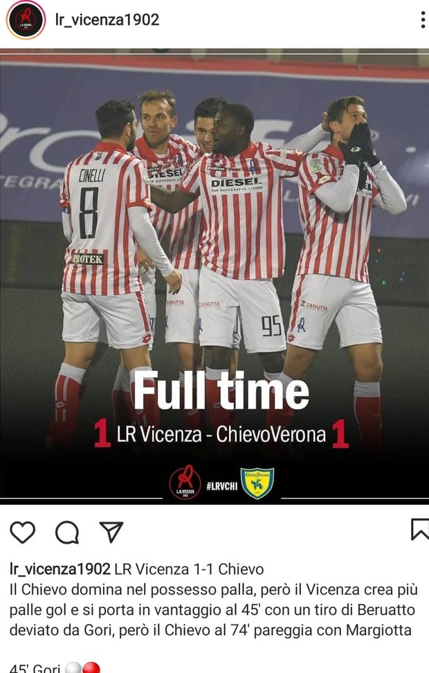Allo stadio Menti di Vicenza, nel recupero del derby veneto rinviato in novembre per il Covid fra Vicenza e Chievo, ottavo turno di Serie B, è finita 1-1, con reti di Gori e Margiotta. Dopo un buon avvio del Chievo, è stato però il Vicenza ad avere le prime occasioni e a segnare al 45esimo minuto con Gori: deviazione vincente dopo un tiro di Beruatto.