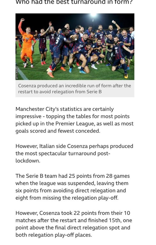 I Maestri inglesi danno ampio e prestigioso spazio alla Serie B italiana. Per merito del Cosenza: "Le statistiche del Manchester City sono certamente impressionanti; in cima alle classifiche per aver raccolto più punti di tutti in Premier League dop il lockdown, e poi per aver avuto il miglior attacco e la miglior difesa. Tuttavia il Cosenza ha forse prodotto la miglior performance post lockdown". Punto e a capo, Fra virgolette. Non sono righe scritte dalla curva del Cosenza, ma addirittura dalla BBC inglese che ha dedicato un servizio di analisi al rendimento nelle ultime settimane di tutte le squadre europee.
