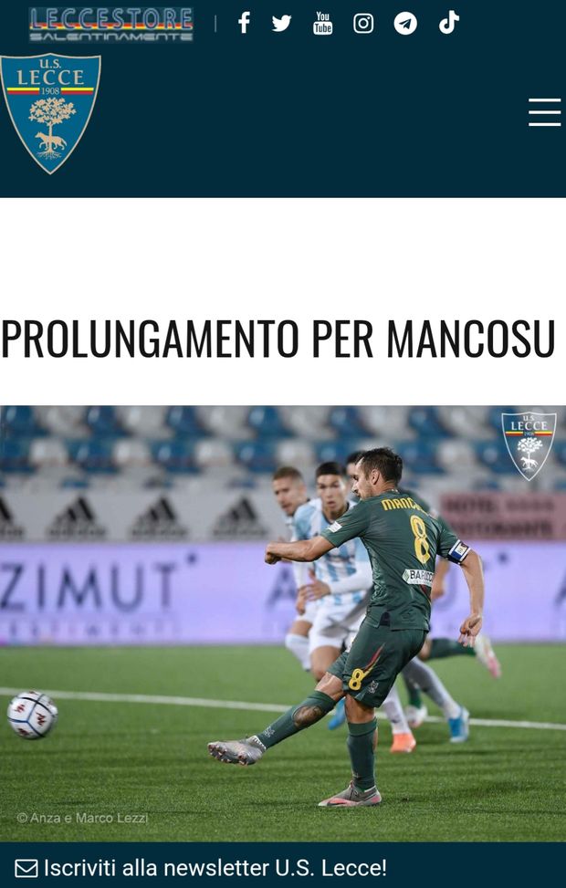 La nota salentina: "L’U.S. Lecce comunica che il calciatore Marco Mancosu ha prolungato il rapporto contrattuale, in scadenza il 30 giugno 2022, fino al termine della stagione sportiva 2022/23. Il capitano giallorosso, arrivato a Lecce nella stagione 2016/17, ha collezionato 153 presenze realizzando 44 reti".