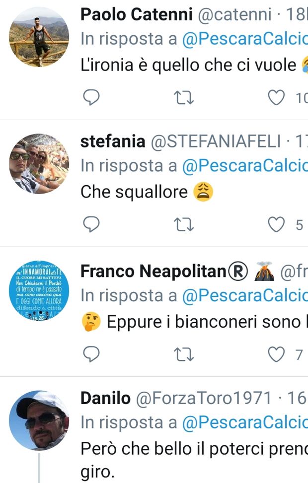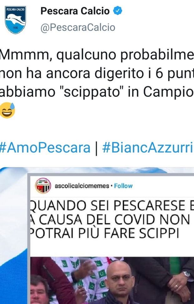 Ma la polemica social che è nata nelle ultime ore, poteva avere un risvolto più acre dopo le accuse partite da Ascoli, ma l'ironia pescarese potrebbe aver risolto la situazione. Sul profilo Instagram ascolicalciomemes è apparsa la frase "Quando sei pescarese e a causa del Covid non potrai fare più scippi". Solo una ventina di like, fra cui quello di mondopicchio, una fanpage dell'Ascoli calcio. Non benissimo associare il virus al calcio, a qualunque livello e per qualsiasi battuta. In ogni caso il profilo Twitter del Pescara ha risposto con garbo: "Ci sono rimasti male per i punti persi", in sostanza la risposta. Poi i commenti dei tifosi...