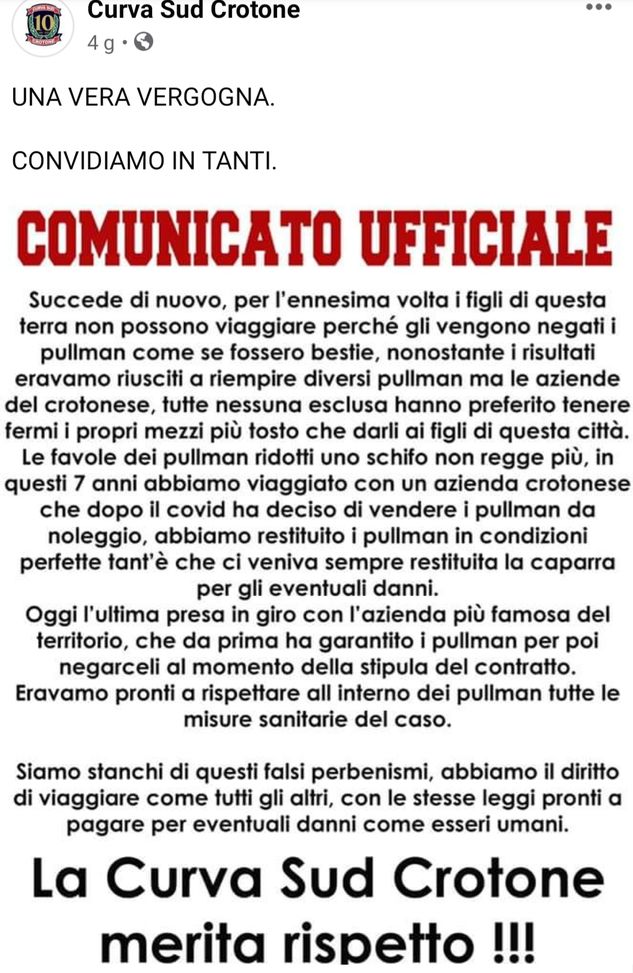 C'erano meno tifosi del Crotone del previsto ad assistere al derby calabrese vinto sabato 1-0 dal Cosenza. Il gruppo Ultras Curva Sud di Crotone aveva infatti prenotato tre autobus, ma si è visto negare i mezzi che gli erano stati promessi: “Per l’ennesima volta i figli di questa terra non possono viaggiare perché gli vengono negati i pullman come se fossero bestie. Nonostante i risultati eravamo riusciti a riempire diversi pullman - la denuncia in un comunicato - ma le aziende del crotonese, tutte nessuna esclusa hanno preferito tenere fermi i propri mezzi piuttosto che darli ai figli di questa città”.