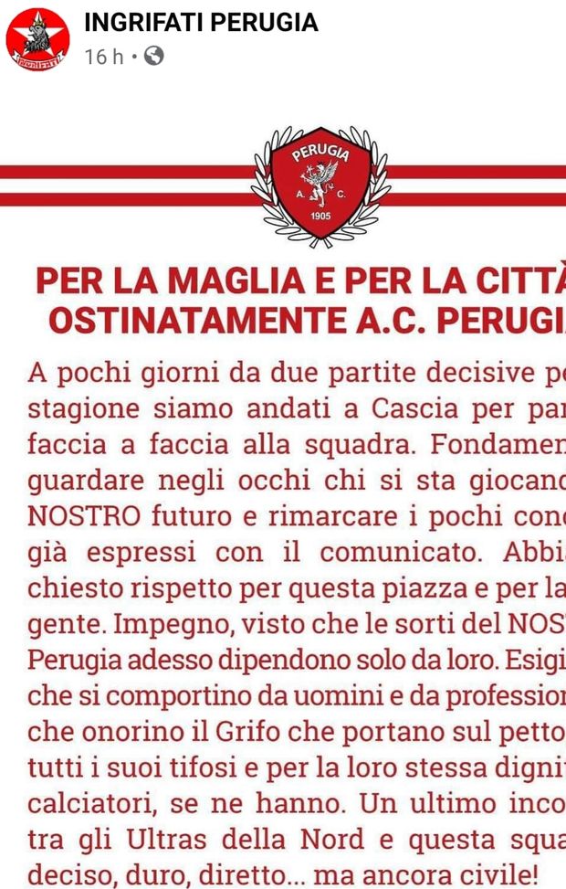 Il testo del comunicato: "A pochi giorni da due partite decisive per la stagione siamo andati a Cascia per parlare faccia a faccia alla squadra. Fondamentale guardare negli occhi chi si sta giocando il NOSTRO futuro e rimarcare i pochi concetti già espressi con il comunicato. Abbiamo chiesto rispetto per questa piazza e per la sua gente. Impegno, visto che le sorti del NOSTRO Perugia adesso dipendono solo da loro. Esigiamo che si comportino da uomini e da professionisti, che onorino il Grifo che portano sul petto, per tutti i suoi tifosi e per la loro stessa dignità di calciatori, se ne hanno. Un ultimo incontro tra gli Ultras della Nord e questa squadra; deciso, duro, diretto… ma ancora civile”.