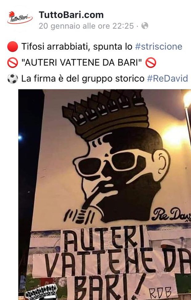 I risultati da un lato, il distacco dalla Ternana capolista dall’altro avevano già generato un clima di complessivo malumore: le dichiarazioni rilasciate domenica scorsa dall’allenatore del Bari che sottolineavano i lati positivi della sofferta vittoria a Bisceglie hanno acuito il malcontento. Risultato, striscione di contestazione a Gaetano Auteri, tecnico siciliano del Bari, con una minaccia nemmeno troppo velata.
