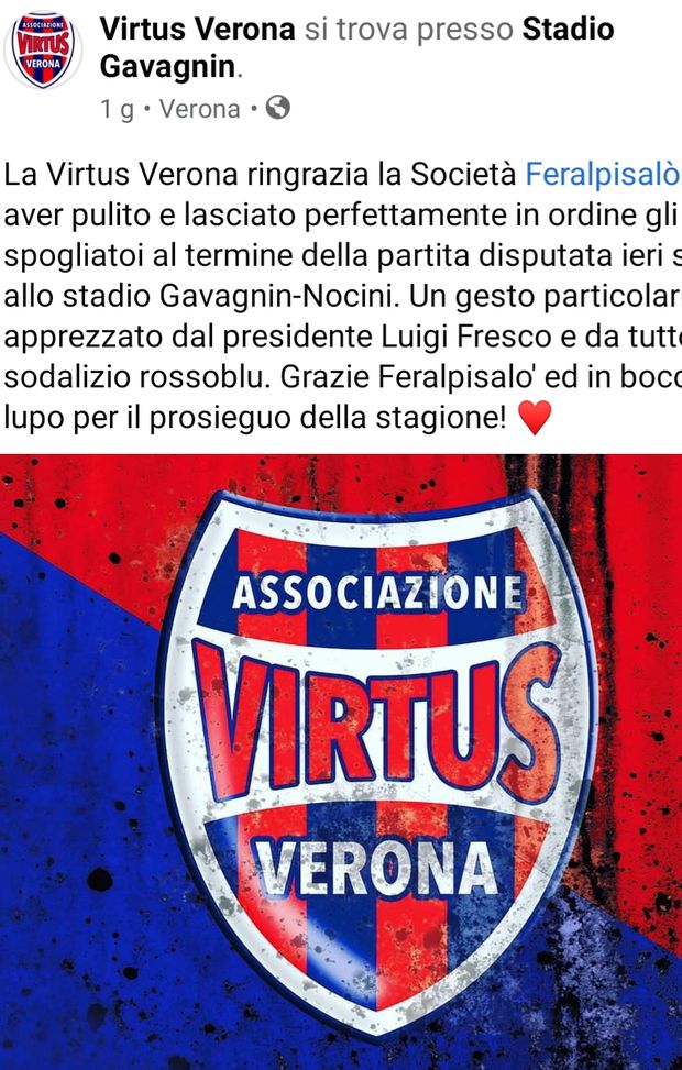 Bel gesto dei giocatori e dello staff della Feralpisalò, squadra che milita nel campionato di Serie C, che dopo la partita persa contro la Virtus Verona è rimasto fino a tarda sera per pulire gli spogliatoi dello Stadio Gavagnin.