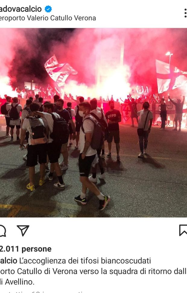 Grande entusiasmo dei tifosi del Padova: bandiere biancoscudate al ritorno della squadra dall'impresa di Avellino