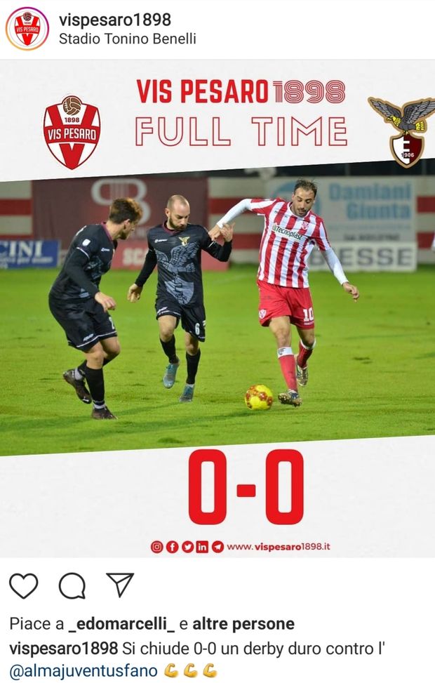 Dopo un primo tempo in crescendo, la Vis Pesaro ha sofferto tantissimo nei secondi 45 minuti. Il Fano alla lunga è stato più aggressivo e pericoloso, trovando anche il gol allo scadere con Carpani, poi annullato perché era in netto fuorigioco, ma che inizialmente era stato convalidato, come racconta Solovispesaro.it. Le tante proteste dei biancorossi hanno fatto tornare sui propri passi l’assistente, cosa che accade spesso in Italia ma solo in Serie A dove c'è il Var... La Vis Pesaro ha rischiato di perdere, facendo troppo poco per vincere: 0-0 il risultato finale.