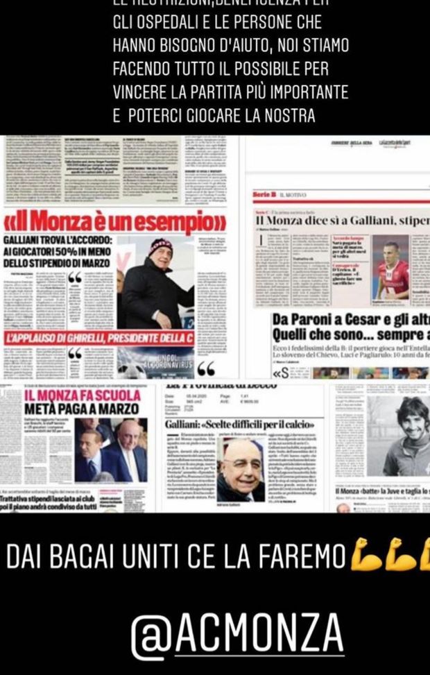 Dopo che i giocatori del Monza hanno deciso di donare la cifra di 25.100 euro all’ Istituto di Ricerche Farmacologiche Mario Negri, il tecnico Cristian Brocchi ha voluto ricordare su Instagram l'esempio dato su tutti i fronti dal Monza in questi tempi molto particolari. Le parole di Cristian Brocchi: “In questo momento il calcio passa in secondo piano: la vera sfida sarà poter tornare alla normalità. Mi sto allenando anche io agli ordini dei nostri preparatori: l’obiettivo è mantenere una condizione accettabile. E per i ragazzi può essere uno stimolo in più quello di vedere il proprio allenatore sudare con loro. È un modo per tenere unito il gruppo ora che la distanza potrebbe allentare i legami. Nei ragazzi vedo la voglia e la volontà di lavorare al massimo. Ma anche il torneo di playstation che la società ha organizzato in questi giorni tra giocatori e tifosi è un modo per non perdere l’abitudine alla competizione e alla voglia di primeggiare”.