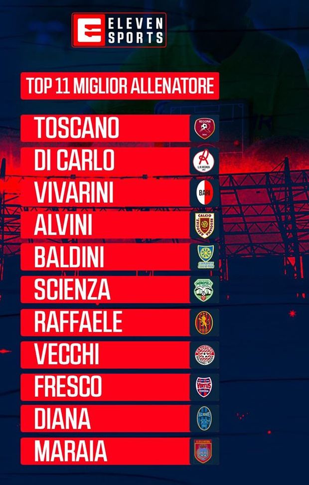 Non c’è il nome di Cristian Brocchi tra i migliori 11 allenatori di tutta la serie C scelti da Eleven Sports. La redazione dell’emittente che trasmette le gare di serie C ha inserito, nell’elenco, Toscano (Reggina), Di Carlo (Vicenza), Vivarini (Bari), Alvini (Reggiana), Baldini (Carrarese), Scienza (Monopoli), Raffaele (Potenza), Vecchi (Sud Tirol), Fresco (Virtus Vecomp Verona), Diana (Renate) e Maraia (Pontedera), ma non il tecnico della capolista del girone A di serie C. Un’esclusione che farà sicuramente discutere…