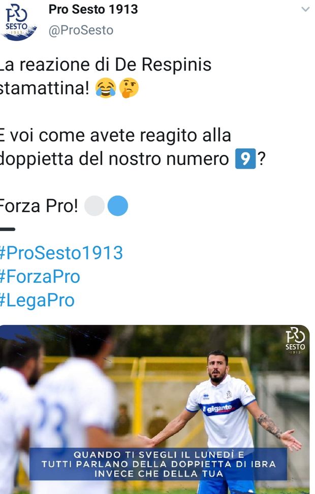 L'euforia in casa Pro Sesto ha prodotto un tweet diventato virale sui social, con il buon De Respinis che si chiede sul profilo ufficiale della società: "Ma perchè tutti parlano della doppietta di Ibra a Napoli e nessuno della mia a Vercelli".