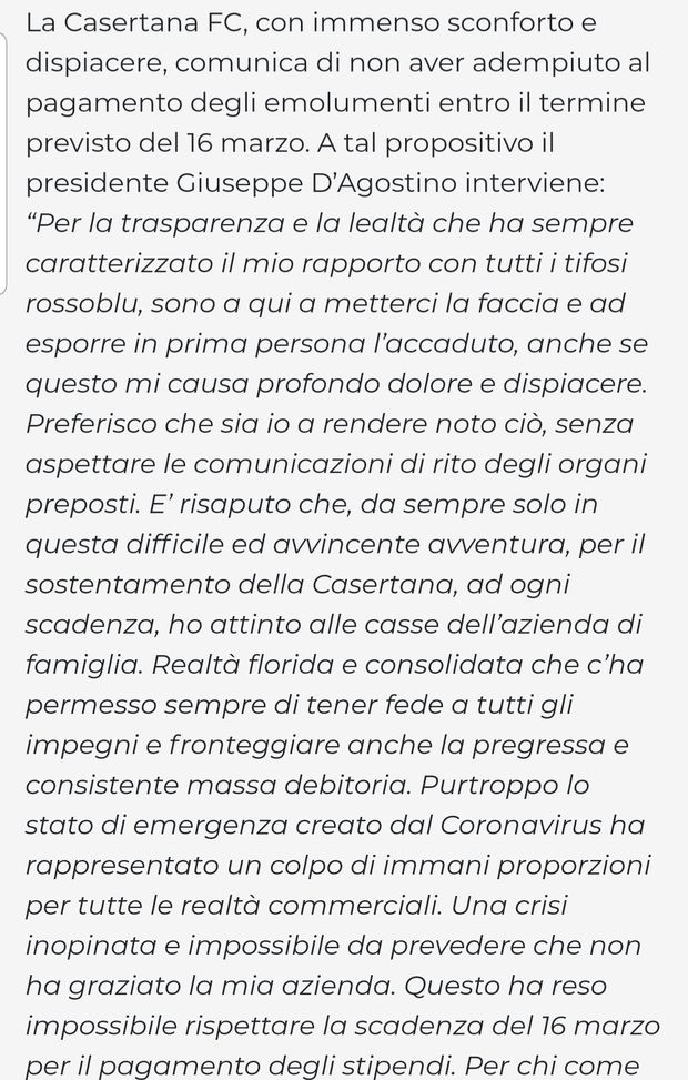 Il testo: "La Casertana FC, con immenso sconforto e dispiacere, comunica di non aver adempiuto al pagamento degli emolumenti entro il termine previsto del 16 marzo. A tal propositivo il presidente Giuseppe D’Agostino interviene: “Per la trasparenza e la lealtà che ha sempre caratterizzato il mio rapporto con tutti i tifosi rossoblu, sono a qui a metterci la faccia e ad esporre in prima persona l’accaduto, anche se questo mi causa profondo dolore e dispiacere. Preferisco che sia io a rendere noto ciò, senza aspettare le comunicazioni di rito degli organi preposti. E’ risaputo che, da sempre solo in questa difficile ed avvincente avventura, per il sostentamento della Casertana, ad ogni scadenza, ho attinto alle casse dell’azienda di famiglia. Realtà florida e consolidata che c’ha permesso sempre di tener fede a tutti gli impegni e fronteggiare anche la pregressa e consistente massa debitoria. Purtroppo lo stato di emergenza creato dal Coronavirus ha rappresentato un colpo di immani proporzioni per tutte le realtà commerciali. Una crisi inopinata e impossibile da prevedere che non ha graziato la mia azienda. Questo ha reso impossibile rispettare la scadenza del 16 marzo per il pagamento degli stipendi. Per chi come me, nel lavoro come nel calcio, ha operato nel pieno rispetto di norme e impegni, questo rappresenta sicuramente un momento di profonda amarezza. Il mio pensiero va a tesserati e dipendenti che, spero, possano comprendere questa triste contingenza. Detto ciò, non lascerò nessuno indietro. E terrò fede a tutti gli impegni assunti, sperando che questo momento di profonda difficoltà per il nostro Paese e non solo, sia presto un cattivo ricordo".