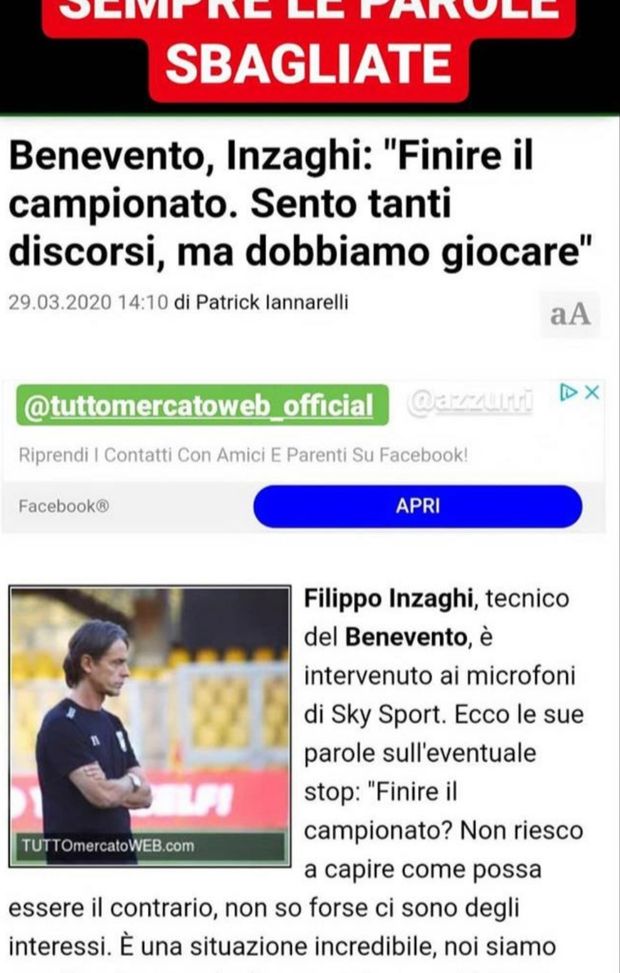 "Va finito per la regolarità del campionato. Sento tanti discorsi, ma la cosa più limpida e giusta è tornare a giocare. Nessuno deve subire danni". Firmato, Filippo Inzaghi.