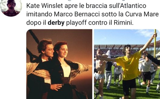 Marco Bernacci festante dopo la vittoria della semifinale play-off con il Rimini in Serie C1 2003-2004, nella quale ha siglato il gol decisivo. Questa foto è diventata virale su Twitter, con un tifoso del Cesena che ha paragonato le sue braccia aperte a quelle delle celebre scena di Titanic con Kate Winslet e Leonardo Di Caprio...