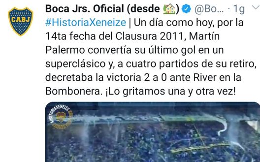Il Boca ha celebrato attraverso i propri social network di nuovo l'anniversario del 2-0 contro il River nel campionato di Clausura 2011: è stato l'ultimo gol di Martin Palermo in un Superclasico e l'ultimo Superclasico prima della crisi del River...